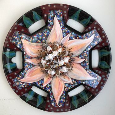 Cleaning the greasy hub caps is the first step- not my favorite part! I then spray paint the back and prime the front before I start to paint my hub cap "canvas'. As a recycle artist I like to rethink before I toss and I am always on the lookout for objects that can be repurposed in a unique way. My hub cap creations are often embellished with other found objects like bottlecaps, plastic lids, aluminum cans, metal bits, window screen, cork, bits of jewelry and the list goes on!