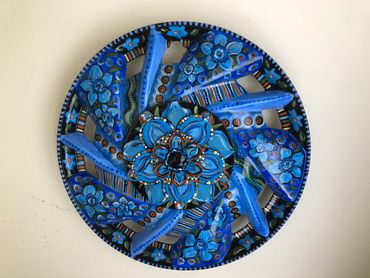 Cleaning the greasy hub caps is the first step- not my favorite part! I then spray paint the back and prime the front before I start to paint my hub cap "canvas'. As a recycle artist I like to rethink before I toss and I am always on the lookout for objects that can be repurposed in a unique way. My hub cap creations are often embellished